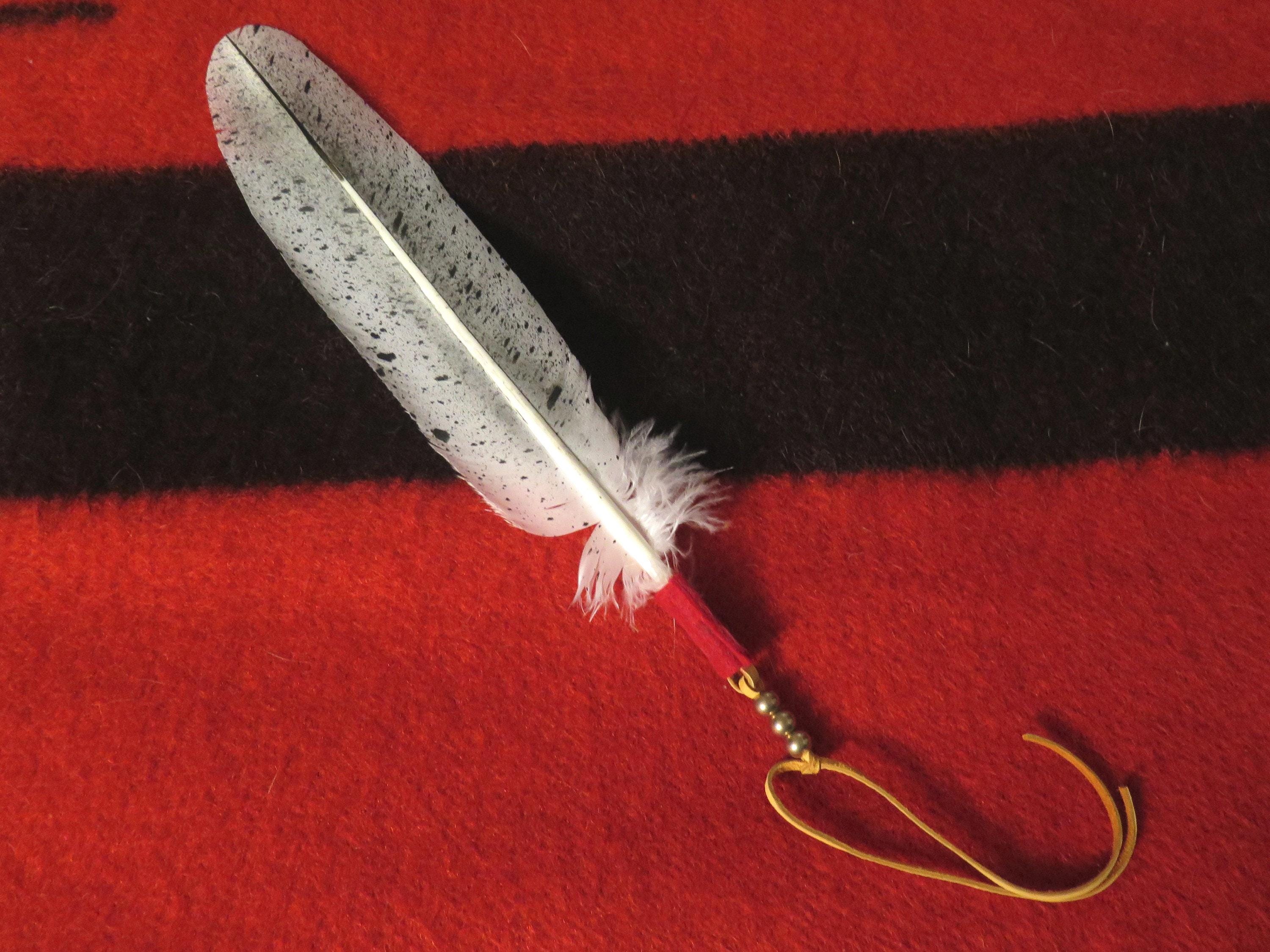 Native American made Salt & Pepper painted feather tie, Bald Eagle Feathers are wrapped trade cloth, leather and Brass Beads