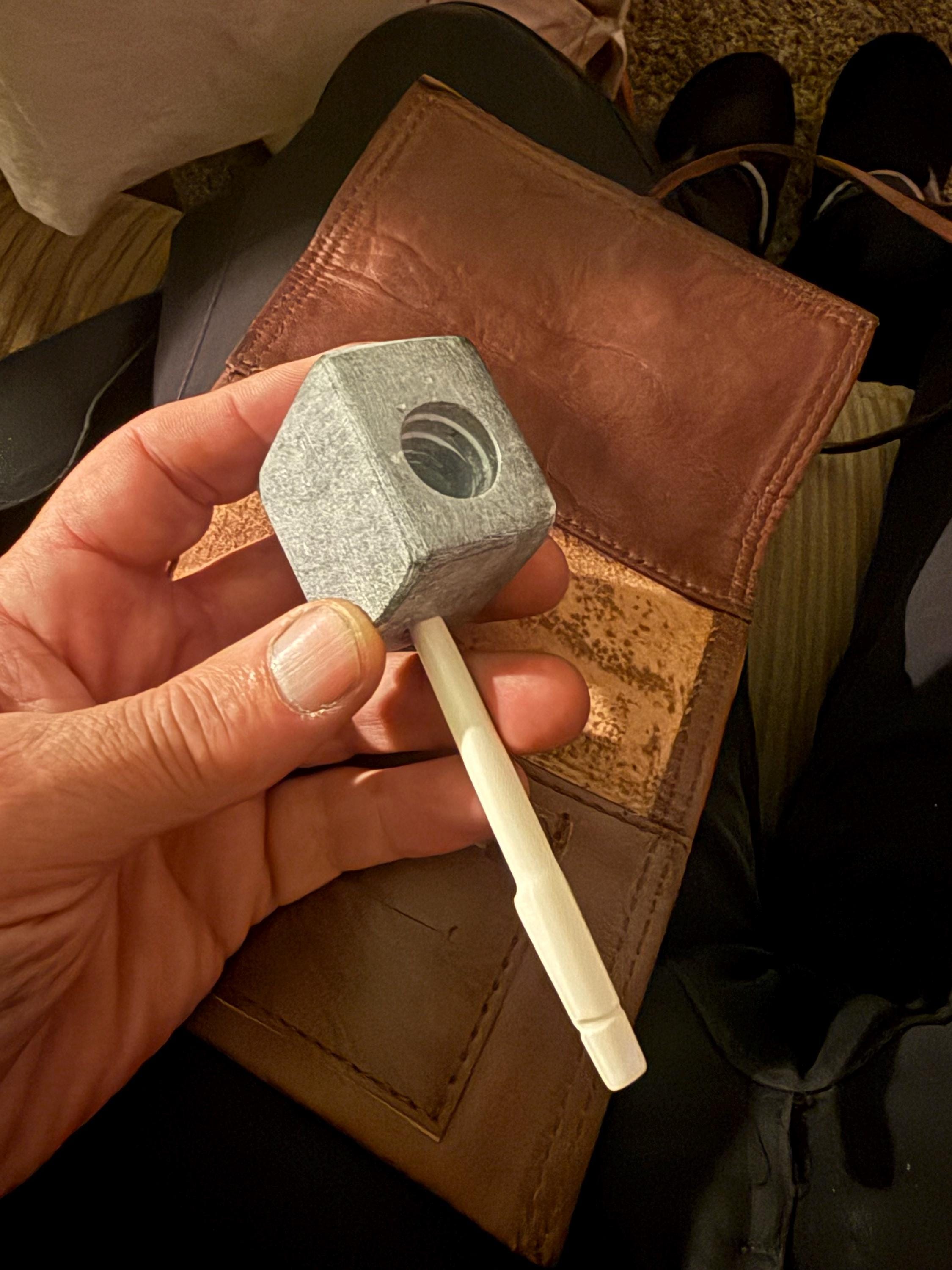 In a level Position, now insert the pipe stem into the Catlinite or Steatite Pipe Stone by twisting it gently until its snug and secure.