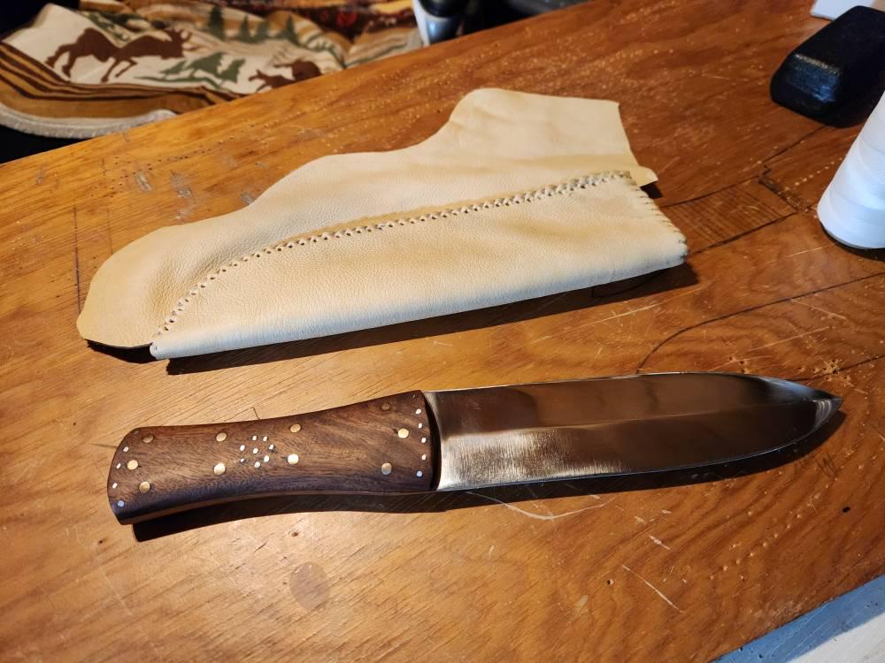 THIS IS A PRIMITIVE HANDMADE INDIAN TRADE KNIFE PATTERNED AFTER AN OLD INDIAN MADE EXAMPLE. A HAND FORGED BLADE WITH A RIVETED HARDWOOD HANDLE AND DECORATIVE BRASS PINS. A FINE 7″ BLADE WITH OVERALL LENGTH APPROX. 12″. A GREAT ADDITION TO YOUR OUTFIT. SHEATH INCLUDED.